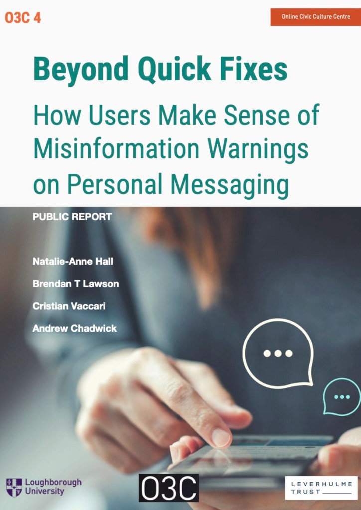 - Don’t rely on description alone. Simply indicating that a feature such as forwarding has been used is not enough. End-to-end encryption means warnings cannot be topic based but they could still more clearly indicate the potential for misinformation than at present.
